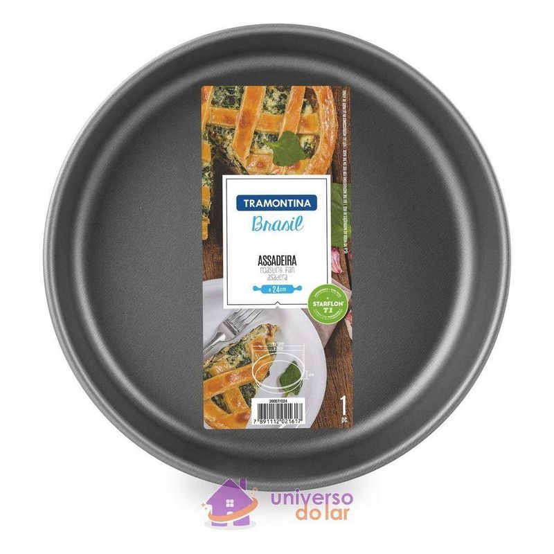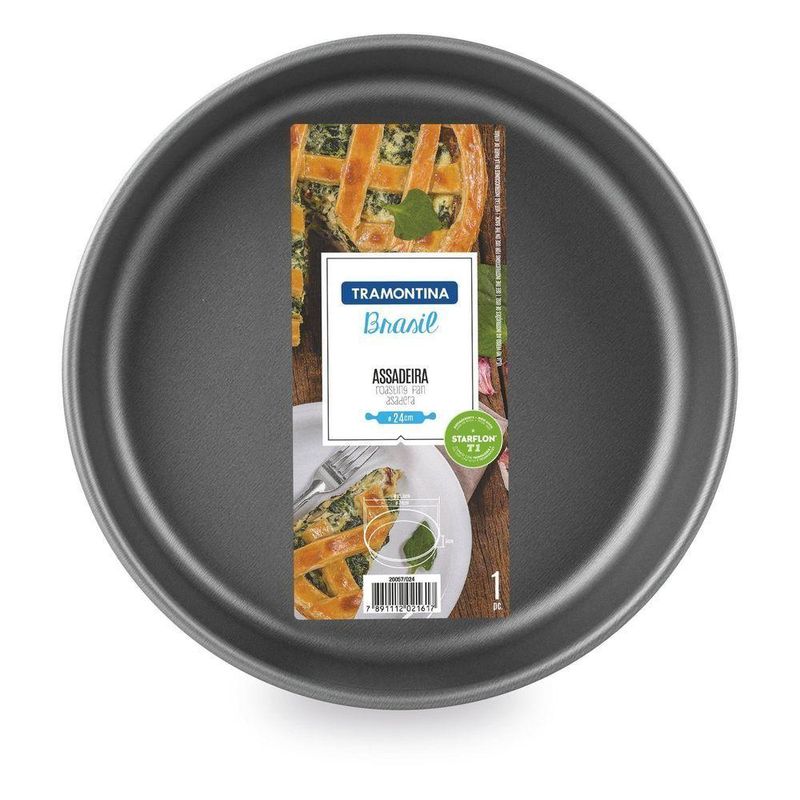 Assadeira Redonda Tramontina Brasil em Alumínio com Revestimento Interno Antiaderente Starflon T1 Grafite 22 cm 1,7 LBolos, tortas, pães ou assados: com a Assadeira Redonda Tramontina Brasil em Alumínio com Revestimento Interno Antiaderente Starflon T1 Grafite 22 cm de diâmetro 1,7 L ficou ainda mais fácil para você se aventurar a preparar diferentes receitas. Redonda e com 22 cm de diâmetro, ela é produzida em alumínio com revestimento interno e externo antiaderente Starflon T1, que permite o cozimento uniforme dos alimentos, possui maior poder antiaderente e maior resistência à abrasão. Pode ser utilizada desde fornos a gás até fornos elétricos; além de ser super fácil de limpar e poder ser levada à máquina de lavar louças. Na cor grafite, ela embeleza também na hora de servir e deixa suas receitas ainda mais incríveis!Informações GeraisCorpo de alumínio com espessura de 0,8 mm que proporciona cozimento rápido e uniforme. Revestimento interno e externo de antiaderente Starflon T1. O único com a tecnologia T: maior poder de antiaderência; maior resistência à abrasão; maior durabilidade; mais fácil para limpar e livre de PFOA, garantindo uma resistência à abrasão acima de 5.000 ciclos segundo a Norma ABNT NBR 15321:2013. Pode ir à máquina de lavar louças facilitando seu dia a dia.