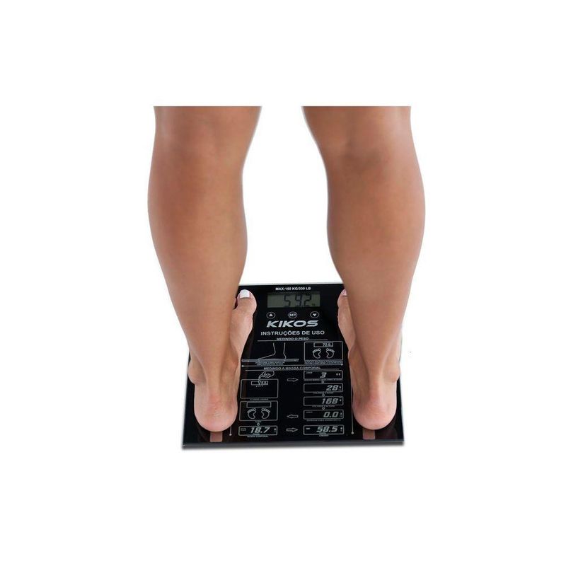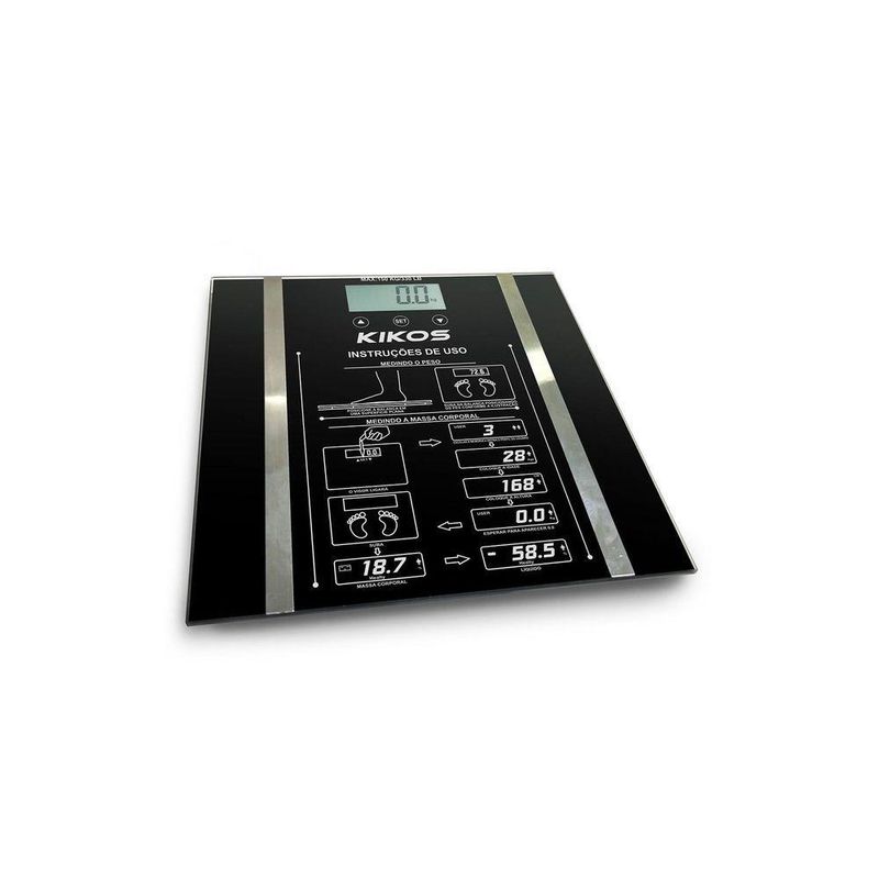Balança Digital Ison Kikos         Indicado:          A balança de bioimpedância Ison Kikos é escolha ideal para você que precisa acompanhar os resultados de seus treinos e dietas com total rapidez e facilidade.               Descrição:               Base de vidro temperado que garante resistência e durabilidade. Capacidade: 2.5kg-150kg (330lb)Graduação: F0.1kg / 0.2lb. Alta precisão. Plataforma de vidro temperado. Auto ligamento e desligamento. Indicação de baixa bateria. Memória de 10 medidas pra 10 usuários. Mede: gordura, água e peso corporal. Percentual gordura corporal e água: 0.1%. Parâmetro de gordura corporal: 4 para 45%. Parâmetro de água: 27.8 para 66%. Bateria: F1*3v lithiumcell CR2032. Peso líquido: 1.47KG. COMPOSIÇÃO: Vidro temperado de 8mm. DIMENSÕES: Tamanho do visor: 7 x 4 cm. Dimensão: 28 x 28 x 2 cm