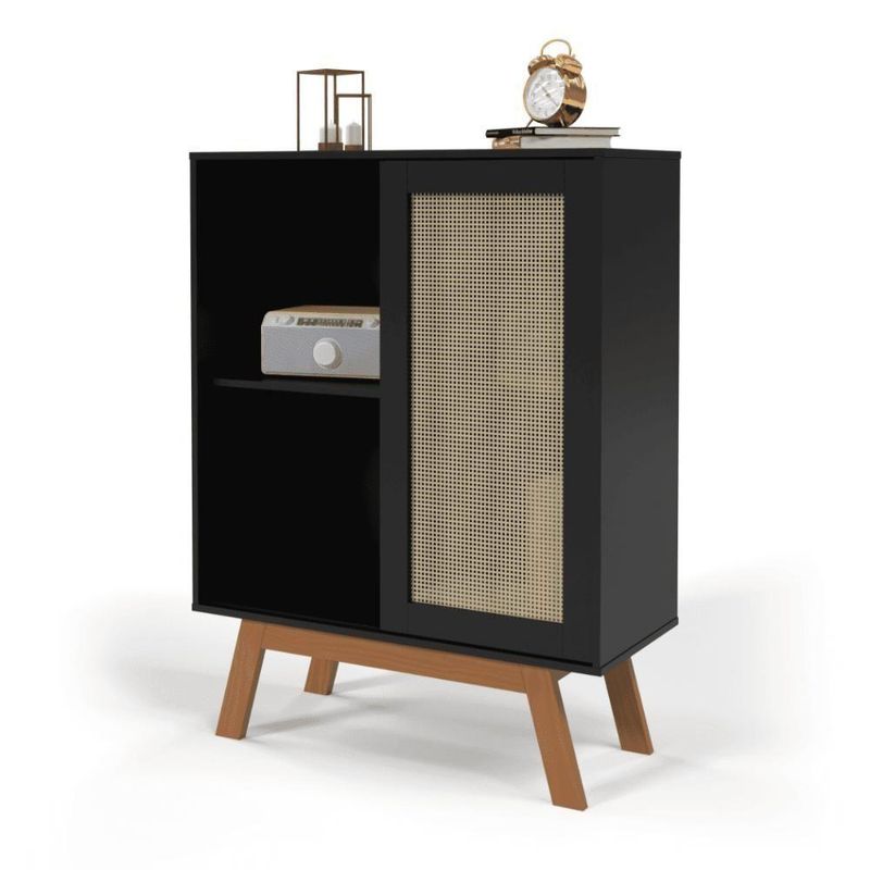 O Aparador Buffet Alto, com porta de correr e detalhes em rattan, é uma peça de destaque para qualquer ambiente. Ospés em madeira preta oferecem robustez e estabilidade, enquanto o design moderno e a funcionalidade do espaço interno garantem um visual elegante e ao mesmo tempo prático para sua sala ou hall de entrada.Dimensões do Produto Montado: