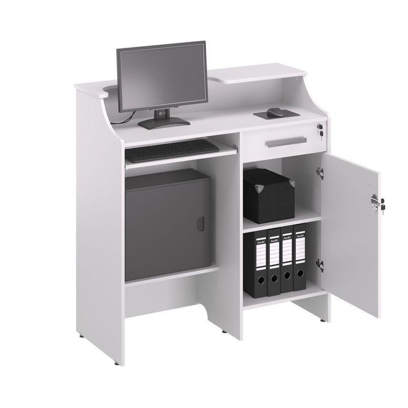 O Balcão proporciona conforto e versatilidade no ao cliente, e traz também a função caixaEm MDP BP ou EUCAPRINT 15 mm, acabamento de bordas em ABS.Tampo com Passa FiosPorta TecladoPorta CPUGaveta com Corrediças Metálicas com Chave e Porta Cédulas, abaixo Porta Objetocom Prateleira.Pés com Niveladores de AlturaDimensões do produto:Altura: 108 cmLargura: 100 cmProfundidade: 45 cmInformações do produto:Gaveta: Sim, com chave e porta cédulas.Apoio para teclado: Sim.Prateleiras: Sim (1).Porta CPU: SimPorta: Sim, com chave.Passa-Fio: Sim.Nichos: NãoLugares: 1Pés: Sim, com niveladores de altura.Porta Cédulas: Sim.Cor: BrancoMaterial principal: MDP BP 15 mmItens inclusos:01 Balcão Caixa.