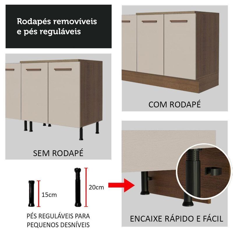 Os pés são em PVC, com regulagem de altura e o rodapé é removível em MDP de fácil encaixe. Além disso, acompanha dois tampos.