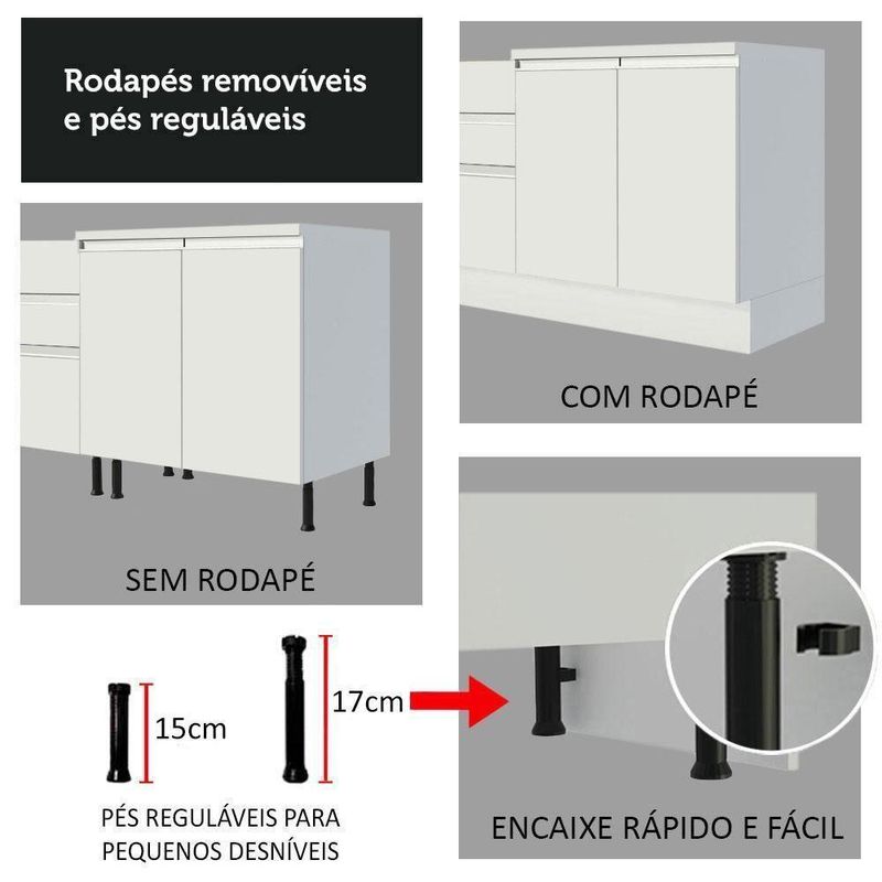 Fabricado 100% em MDF, possui puxadores em alumínio, dobradiças metálicas e rodapé encaixado com pés em PVC com regulagem de altura.