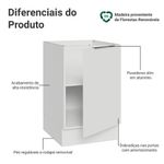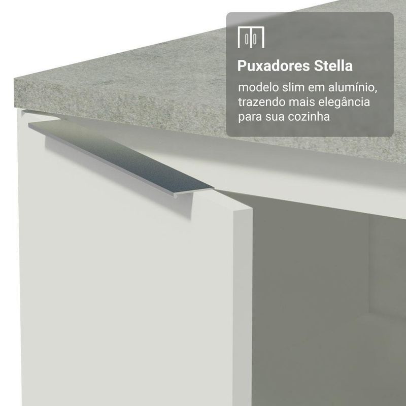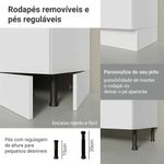 As portas contam com dobradiças com amortecimento, oferecendo um fechamento suave e silencioso. O balcão possui pés com regulagem de altura e rodapé removível, tornando a limpeza mais fácil.