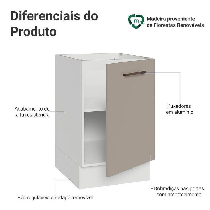 O móvel possui dobradiças metálicas com amortecimento, garantindo um fechamento suave e silencioso, possui pés reguláveis e o rodapé removível facilita a limpeza.