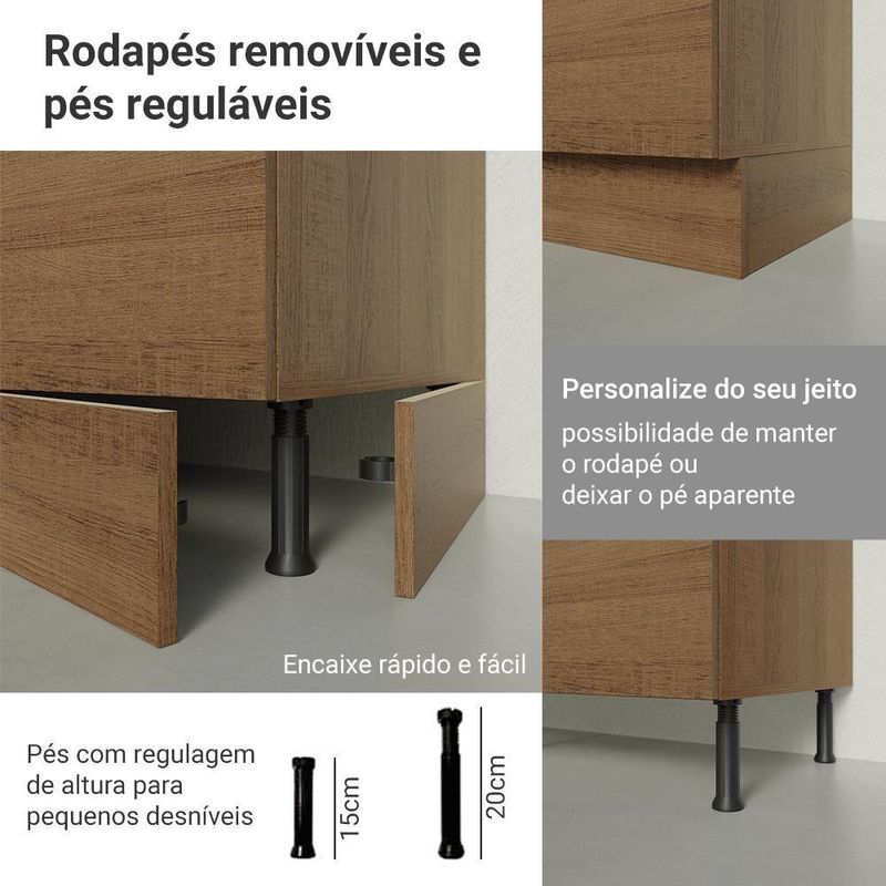 As portas contam com dobradiças com amortecimento, oferecendo um fechamento suave e silencioso. O balcão possui pés com regulagem de altura e rodapé removível, tornando a limpeza mais fácil.