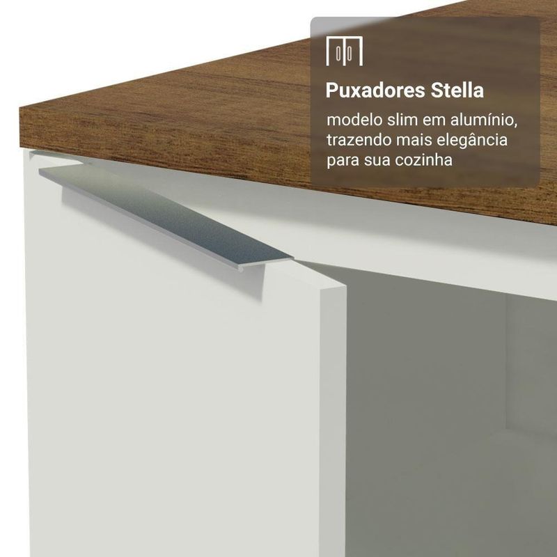 O interior com dois nichos espaçosos para armazenar itens essenciais da cozinha. As portas contam com dobradiças com amortecimento, oferecendo um fechamento suave e silencioso. O balcão possui pés com regulagem de altura e rodapé removível, tornando a limpeza mais fácil.