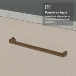 O acabamento da estrutura é branco e a porta no tom crema, transmitindo aconchego e leveza. O destaque fica por conta do puxador bronze, que adiciona um toque sofisticado ao móvel. O design em alça garante praticidade e valoriza ainda mais.