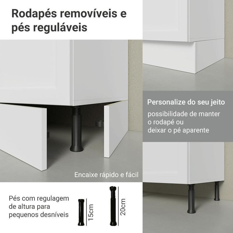 O acabamento de alta resistência da estrutura e da porta é em Branco. Possui uma textura suave ao toque, trazendo leveza e sofisticação ao ambiente. O destaque fica por conta do puxador ponto em ouro envelhecido, feito com metal resistente, traz personalidade e um charme único. Outro diferencial está no detalhe chanfrado das frentes, que forma molduras elegantes e dá profundidade ao design, refletindo o estilo americano com um toque moderno.