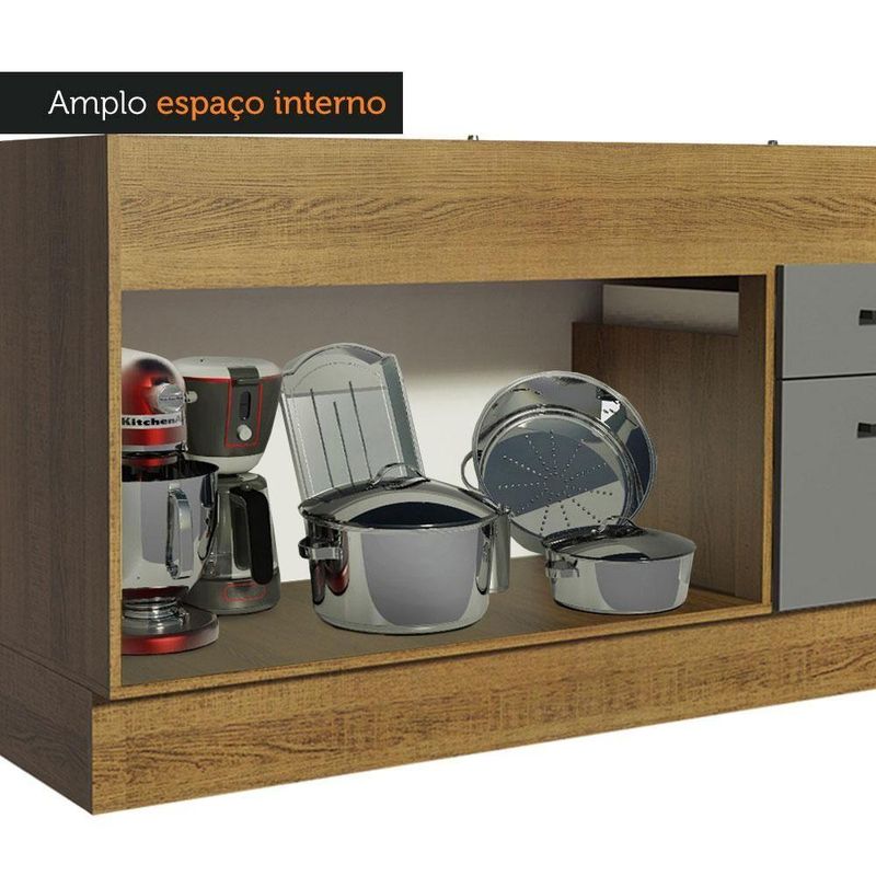 É fabricado com materiais nobres como puxadores com alça em alumínio, dobradiças metálicas com amortecimento e corrediças telescópicas para abertura total das gavetas. É ideal para organizar tudo na sua cozinha.