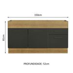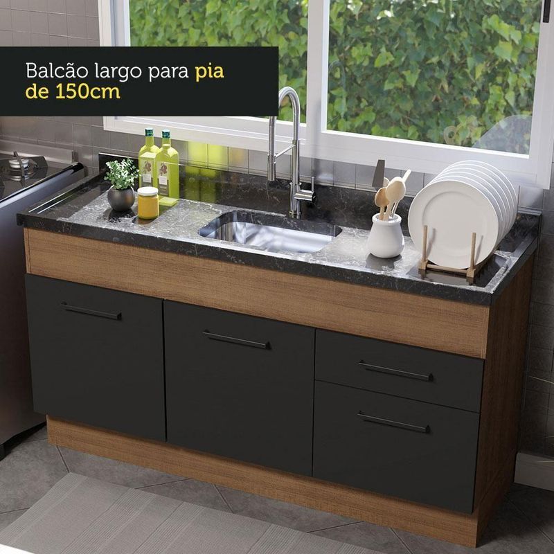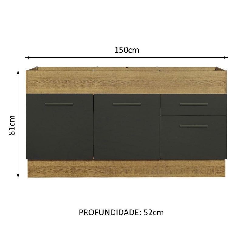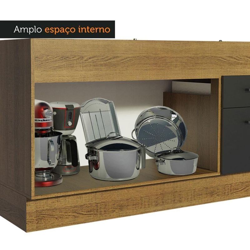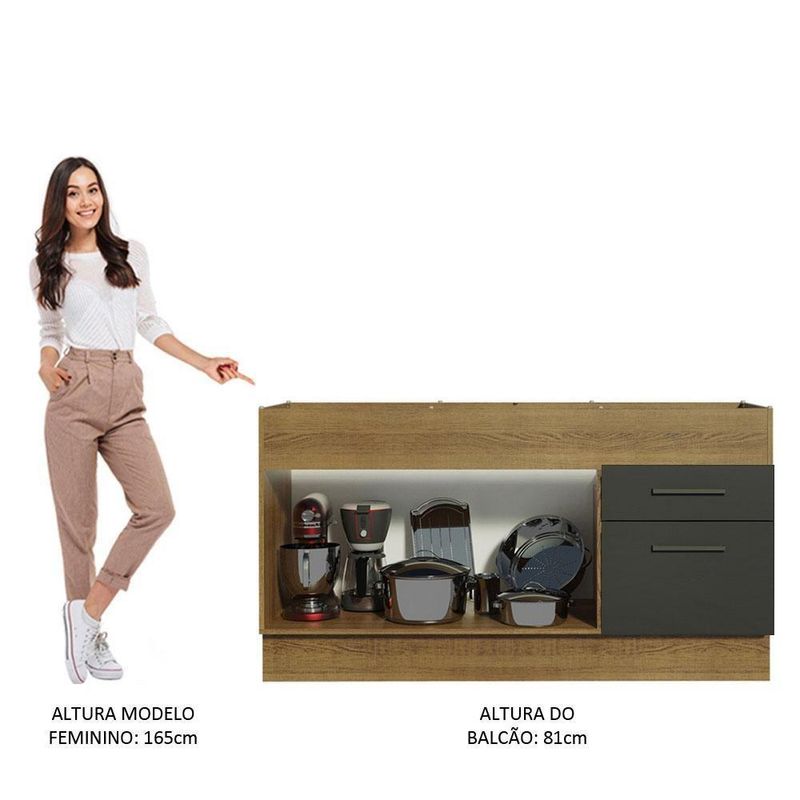 Os pés são em PVC, com regulagem de altura e o rodapé é removível em MDP de fácil encaixe. Além disso, acompanha dois tampos encaixados em pintura Rustic.