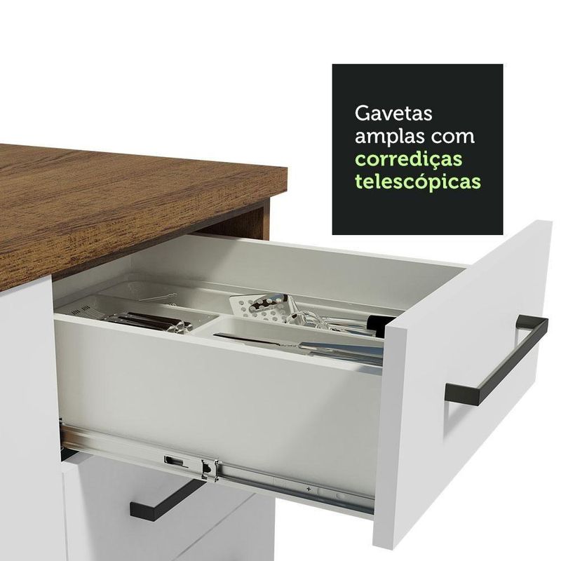 O balcão possui três gavetas grandes, sendo a última mais profunda, todas com puxadores em alumínio e corrediças telescópicas que possibilitam a abertura total.