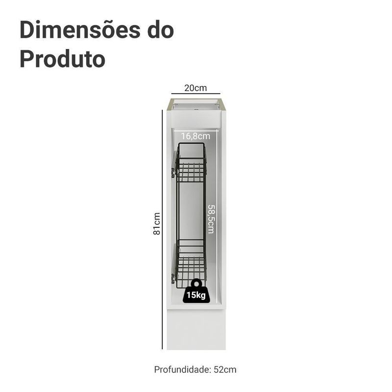 Garantia: Este produto conta com 1 ano de garantia total, sendo 3 meses de garantia legal e 9 meses de garantia contratual. A garantia cobre exclusivamente defeitos de fabricação e vícios ocultos. Não estão cobertos: problemas decorrentes de montagem incorreta, uso inadequado, exposição à umidade, calor ou luz solar direta, modificações no produto ou desgaste natural. Cor: Azul | Garantia: 12 meses | Dimensões - Altura: 81 | Dimensões - Largura: 20 | Dimensões - Profundidade: 52 | Produto: Cozinha | Marca: Madesa | Peso aproximado: 12 | Material: MDP | Estado de Origem: RS | Conteúdo da embalagem: 1 Balcão Gabinete | Material para Filtro: MDP | Instruções/Cuidados: Utilize um pano limpo, levemente umedecido e seque em seguida a superfície. Não usar produtos químicos ou abrasivos para a limpeza. Recomendamos polir seu móvel com lustra-móveis duas a três vezes por ano. | Produto precisa de Montagem?: Sim | Peso Produto Com Embalagem (Kg): 12,20 | Altura do Produto com Embalagem (cm): 54,10 | Largura Produto Com Embalagem (cm): 50,40 | Comprimento Produto Com Embalagem (cm): 80,80 | Descrição do Tamanho: 81 cm x 20 cm x 52 cm | Nome do Simples no Fornecedor: Balcão Porta-Temperos 20 cm 1 Porta (Sem Tampo) Branco/Azul Vik Madesa | Fabricante: Madesa | RBN: Casa/Móveis/Móveis de Cozinha | Materiais do corpo: MDP | Quantidade de caixas de embalagem: 3 | Bullet Point 1: Dimensões: 81 cm altura x 20 cm largura x 52 cm profundidade | Bullet Point 2: O organizador metálico interno possui deslizamento suave com abertura total. | Bullet Point 3: O puxador ponto em ouro envelhecido, feito com metal resistente, trazem personalidade e um charme único. | Bullet Point 4: Possui acabamento de alta resistência, conservando a beleza do móvel por muito mais tempo. | É Frágil: Não | Quantidade de Itens: 1 | Certificação de teste externa: Sim | Precisa de baterias ou pilhas: Não | Número da peça (part_number): G24208L8VKST | Peso do item (item_weight): value=12.02;unit=kilograms | Dimensões do item P x L x A (item_depth_width_height): depth#value=52;depth#unit=centimeters;height#value=81;height#unit=centimeters;width#value=20;width#unit=centimeters | Exige montagem (is_assembly_required): Sim | Requer montagem (REQUIRES_ASSEMBLY): Sim | Inclui manual de montagem (INCLUDES_ASSEMBLY_MANUAL): Sim | Número do modelo (model_number): G24208L8VKST | is_assembly_required: Sim | Tipo de móveis de cozinha: Balcão | Linha: Vik | Componetes Incluidos: Portas | Cor: Branco/Azul