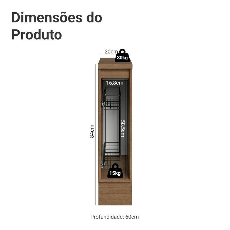 Garantia: Este produto conta com 1 ano de garantia total, sendo 3 meses de garantia legal e 9 meses de garantia contratual. A garantia cobre exclusivamente defeitos de fabricação e vícios ocultos. Não estão cobertos: problemas decorrentes de montagem incorreta, uso inadequado, exposição à umidade, calor ou luz solar direta, modificações no produto ou desgaste natural. Cor: Cinza | Garantia: 12 meses | Dimensões - Altura: 84 cm | Dimensões - Largura: 20 cm | Dimensões - Profundidade: 60 cm | Produto: Cozinha | Marca: Madesa | Peso aproximado: 17 kg | Material: MDP | Estado de Origem: RS | Conteúdo da embalagem: 1 Porta Temperos | Material para Filtro: MDP | Instruções/Cuidados: Utilize um pano limpo, levemente umedecido e seque em seguida a superfície. Não usar produtos químicos ou abrasivos para a limpeza. Recomendamos polir seu móvel com lustra-móveis duas a três vezes por ano. | Produto precisa de Montagem?: Sim | Peso Produto Com Embalagem (Kg): 16.899999999999999 | Altura do Produto com Embalagem (cm): 60,40 | Largura Produto Com Embalagem (cm): 59,30 | Comprimento Produto Com Embalagem (cm): 80,80 | Descrição do Tamanho: 84 cm x 20 cm x 60 cm | Nome do Simples no Fornecedor: Balcão Porta-Temperos 20cm 1 Porta (Com Tampo) Rustic/Cinza Lux Madesa | Fabricante: Madesa | RBN: Casa/Móveis/Móveis de Cozinha | Materiais do corpo: MDP | Quantidade de caixas de embalagem: 4 | Bullet Point 1: Dimensões: 84 cm altura x 20 cm largura x 60 cm profundidade | Bullet Point 2: Possui dobradiças metálicas com amortecimento, garantindo um fechamento suave e silencioso. | Bullet Point 3: Os puxadores reforçados, com acabamento em aço escovado champagne, elevam o design e trazem um toque sofisticado. | Bullet Point 4: Possui acabamento de alta resistência, conservando a beleza do móvel por muito mais tempo. | É Frágil: Não | Quantidade de Itens: 1 | Certificação de teste externa: Sim | Precisa de baterias ou pilhas: Não | Número da peça (part_number): G222029NLXCT | Peso do item (item_weight): value=16.9;unit=kilograms | Dimensões do item P x L x A (item_depth_width_height): depth#value=60;depth#unit=centimeters;height#value=84;height#unit=centimeters;width#value=20;width#unit=centimeters | Exige montagem (is_assembly_required): Sim | Requer montagem (REQUIRES_ASSEMBLY): Sim | Inclui manual de montagem (INCLUDES_ASSEMBLY_MANUAL): Sim | Número do modelo (model_number): G222029NLXCT | is_assembly_required: Sim | Tipo de móveis de cozinha: Balcão | Linha: Lux | Componetes Incluidos: Portas | Cor: Rustic/Cinza