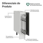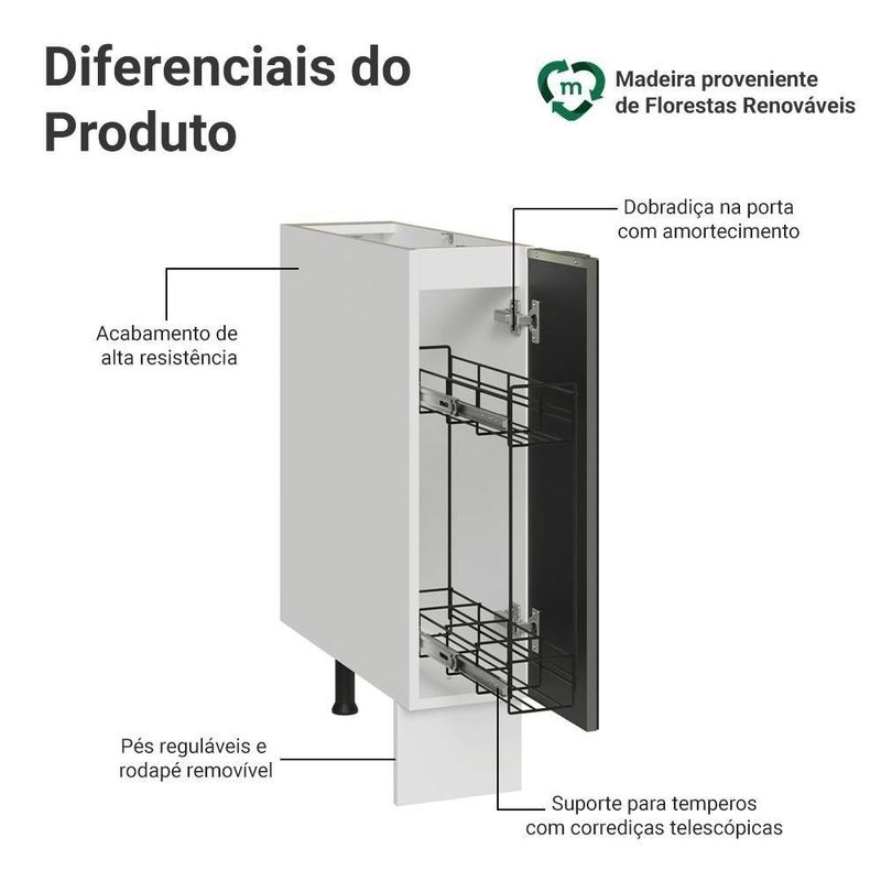 Equipado com um organizador metálico exclusivo, que desliza suavemente através de corrediças de abertura total, garantindo acesso fácil. A porta possui dobradiças com amortecimento, garantindo um fechamento suave e silencioso. Os pés são reguláveis e o rodapé é removível, facilitando a limpeza da parte inferior.