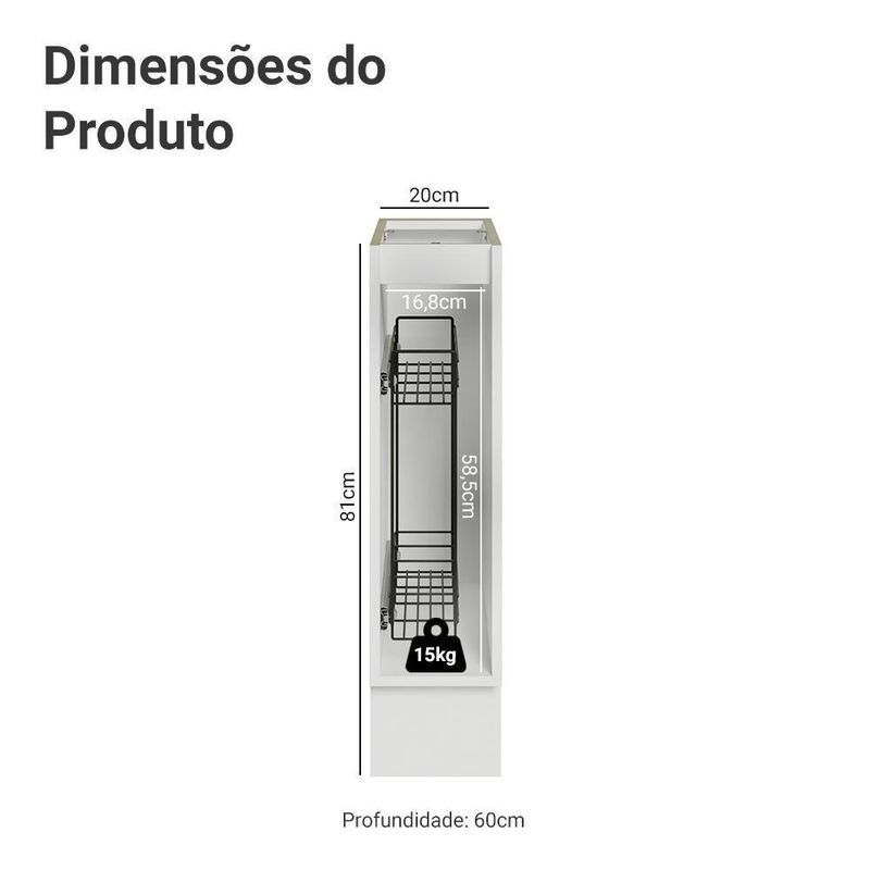 Garantia: Este produto conta com 1 ano de garantia total, sendo 3 meses de garantia legal e 9 meses de garantia contratual. A garantia cobre exclusivamente defeitos de fabricação e vícios ocultos. Não estão cobertos: problemas decorrentes de montagem incorreta, uso inadequado, exposição à umidade, calor ou luz solar direta, modificações no produto ou desgaste natural. Cor: Preto | Garantia: 12 meses | Dimensões - Altura: 81 cm | Dimensões - Largura: 20 cm | Dimensões - Profundidade: 60 cm | Produto: Cozinha | Marca: Madesa | Peso aproximado: 15 kg | Material: MDP | Estado de Origem: RS | Conteúdo da embalagem: 1 Porta Temperos | Material para Filtro: MDP | Instruções/Cuidados: Utilize um pano limpo, levemente umedecido e seque em seguida a superfície. Não usar produtos químicos ou abrasivos para a limpeza. Recomendamos polir seu móvel com lustra-móveis duas a três vezes por ano. | Produto precisa de Montagem?: Sim | Peso Produto Com Embalagem (Kg): 14.6 | Altura do Produto com Embalagem (cm): 56,80 | Largura Produto Com Embalagem (cm): 59,30 | Comprimento Produto Com Embalagem (cm): 80,80 | Descrição do Tamanho: 81 cm x 20 cm x 60 cm | Nome do Simples no Fornecedor: Balcão Porta-Temperos 20cm 1 Porta (Sem Tampo) Branco/Preto Lux Madesa | Fabricante: Madesa | RBN: Casa/Móveis/Móveis de Cozinha | Materiais do corpo: MDP | Quantidade de caixas de embalagem: 3 | Bullet Point 1: Dimensões: 81 cm altura x 20 cm largura x 60 cm profundidade | Bullet Point 2: Possui dobradiças metálicas com amortecimento, garantindo um fechamento suave e silencioso. | Bullet Point 3: Os puxadores reforçados, com acabamento em aço escovado champagne, elevam o design e trazem um toque sofisticado. | Bullet Point 4: Possui acabamento de alta resistência, conservando a beleza do móvel por muito mais tempo. | É Frágil: Não | Quantidade de Itens: 1 | Certificação de teste externa: Sim | Precisa de baterias ou pilhas: Não | Número da peça (part_number): G2220273LX | Peso do item (item_weight): value=14.6;unit=kilograms | Dimensões do item P x L x A (item_depth_width_height): depth#value=60;depth#unit=centimeters;height#value=81;height#unit=centimeters;width#value=20;width#unit=centimeters | Exige montagem (is_assembly_required): Sim | Requer montagem (REQUIRES_ASSEMBLY): Sim | Inclui manual de montagem (INCLUDES_ASSEMBLY_MANUAL): Sim | Número do modelo (model_number): G2220273LX | is_assembly_required: Sim | Tipo de móveis de cozinha: Balcão | Linha: Lux | Componetes Incluidos: Portas | Cor: Branco/Preto