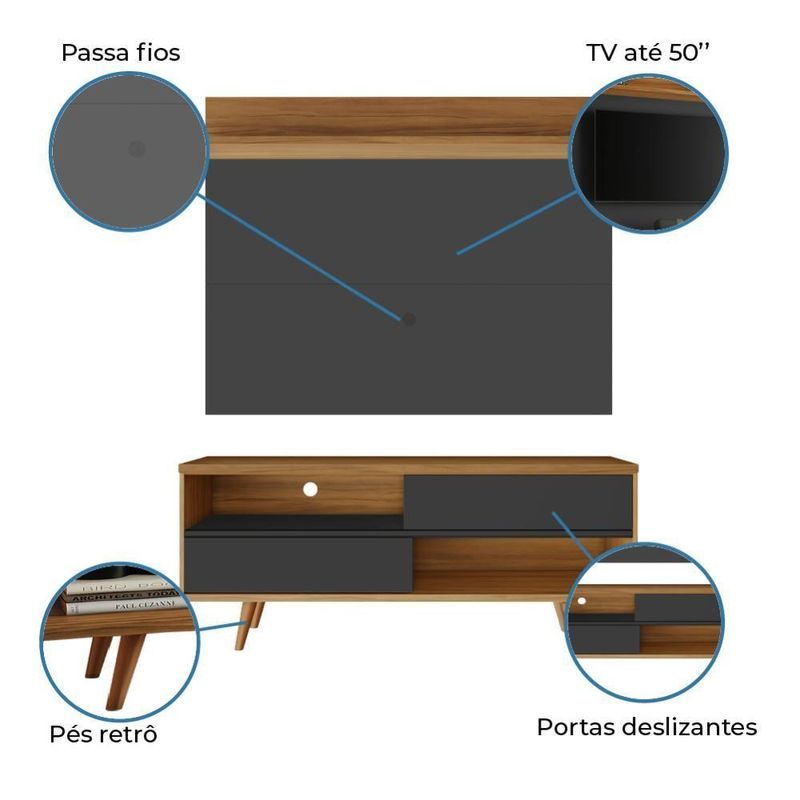 Sua sala de estar ficará muito mais bonita e aconchegante com o Conjunto Notável! Proporcionando beleza, modernidade e bom gosto ao ambiente. Ideal para tvs de até 50. Além de ser um produto fácil de montar, é um item completo, que não só comporta sua , mas conta com uma prateleira para acomodar seus aparelhos eletrônicos, e objetos decorativos. A bancada retrô possui duas portas deslizantes, garantindo flexibilidade a você. Com o conjunto Notável, sua única tarefa será se aconchegar no sofá para assistir sua série favorita.