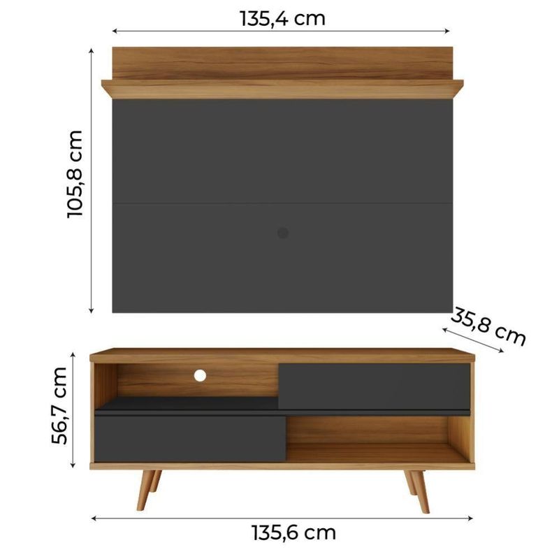 MODELO: Rack com Painel para de até 50 Polegadas | Medidas do Combo (Painel + Rack): [ A ] = 162,5 cm [ L ] = 135,6 cm [ P ] = 35,8 cm | MARCA: Notável | COR: Preto / Freijó Trend | ACABAMENTO: Fosco | PINTURA: UV | SUPORTA : de até 50 Polegadas | PORTAS: 2 | TIPO DE PORTA: Deslizante | NICHO: 2 | PÉS: 4 | MEDIDAS PAINEL: A: 105,8 cm L: 135,3 cm P: 20,3 cm | MEDIDAS RACK: A: 56,7 cm L: 135,6 cm P: 35,8 cm | ESPAÇO PARA EQUIPAMENTOS ELETRÔNICOS: Sim | ESPELHOS: Não | VIDROS: Não | PASSA CABOS: Sim | PESO TOTAL DO PRODUTO: 75 kg | ITENS INCLUSOS: 1 Painel e 1 Rack | GARANTIA: 3 meses | OBS: Montagem não inclusa. Entregamos até a porta de entrada da casa do cliente ou até a portaria do condomínio. Cor: Preto