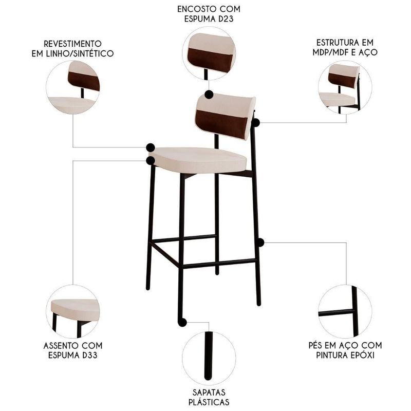 Seu revestimento em linho com detalhe em sintético oferece um toque sofisticado, enquanto o assento em espuma D33 proporciona um conforto superior, adequado para longos períodos de uso. O encosto curvado com espuma D23, complementa a experiência de conforto e estabilidade. Produzida com MDF/MDP no assento e encosto, a banqueta garante robustez e resistência. A estrutura em aço com pintura epóxi da Banqueta Para Bancada assegura durabilidade, tornando-a ideal para ambientes dinâmicos, como Cozinhas, bares e áreas gourmet. Sua combinação de design moderno e materiais de alta qualidade faz da Banqueta Cozinha uma excelente escolha para quem busca praticidade, estilo e longevidade em seus móveis.