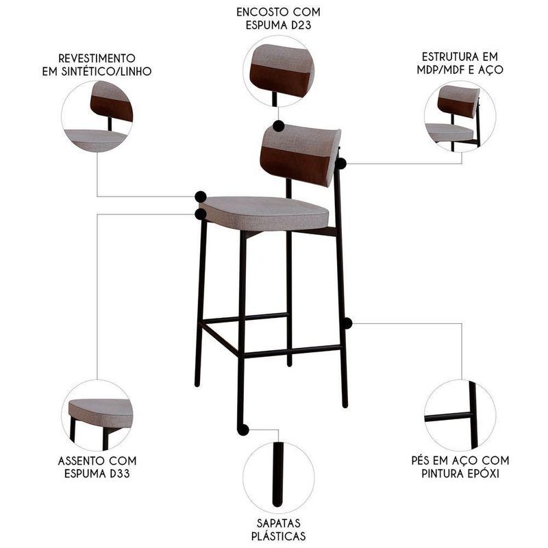 O revestimento em linho com detalhe em sintético do kit de banquetas oferece um toque sofisticado, enquanto o assento em espuma D33 proporciona um conforto superior, adequado para longos períodos de uso. O encosto curvado com espuma D23, complementa a experiência de conforto e estabilidade. Produzida com MDF/MDP no assento e encosto, a banqueta garante robustez e resistência. A estrutura em aço com pintura epóxi da Banqueta Para Bancada assegura durabilidade, tornando-a ideal para ambientes dinâmicos, como Cozinhas, bares e áreas gourmet. Sua combinação de design moderno e materiais de alta qualidade faz da Banqueta Cozinha uma excelente escolha para quem busca praticidade, estilo e longevidade em seus móveis.