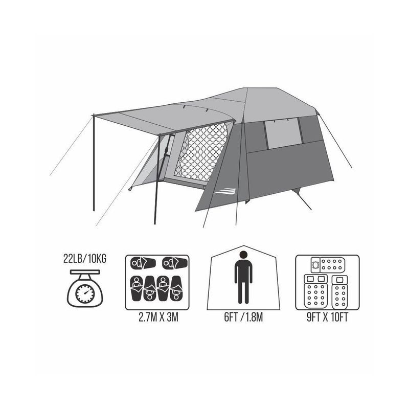 Material do Sobreteto: 100% poliéster impermeabilizado com poliuretanoMaterial da Estrutura: Armações em aço com revestimento anticorrosivo e pintura epóxiMaterial do Dormitório: 100% poliéster 190T respirávelMaterial do Piso: Poliéster e poliuretanoMaterial da Tela: Poliéster super fino, do tipo NO-SEE-UMMedidas: 1,80 x 2,70 x 3,00mPeso: 10kgColuna d'água: 3000mmCapacidade: 6 pessoas