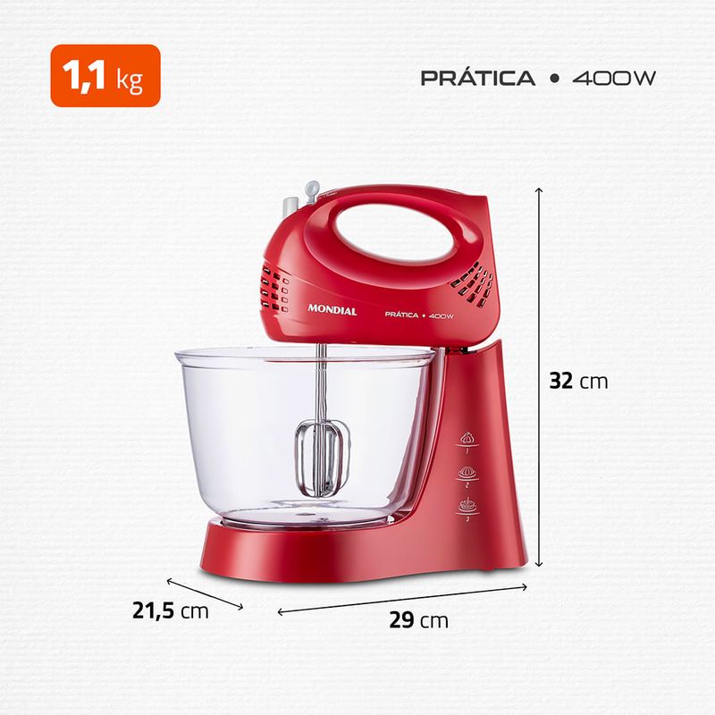 Prepare receitas em dobro com a Batedeira Prática B-45-R Mondial. Com 400W de potência, 3 velocidades para controlar o ponto das receitas e função turbo para aumentar o desempenho, ela é ideal para praticar a criatividade na cozinha. Vem com 2 tigelas: uma maior de 3,6 litros e uma menor de 2,3 litros. Conta com batedores em aço cromado, que são mais resistentes e deixam a massa no ponto certo. Saiba mais sobre a B-45-R da Mondial: