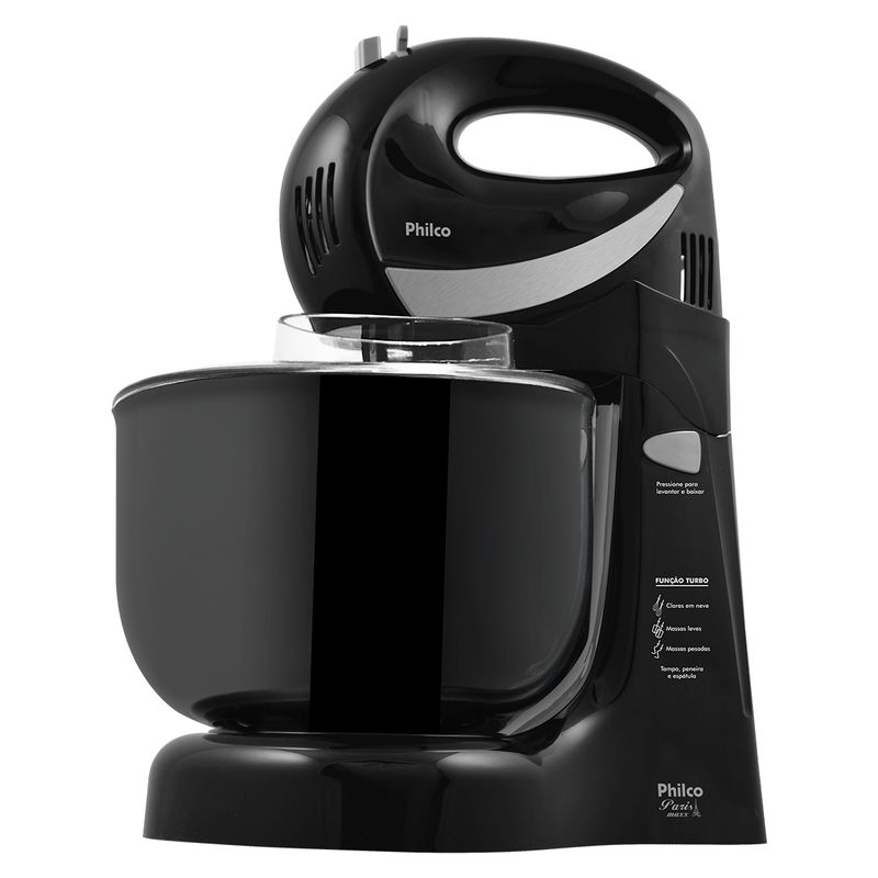 Possui 350W de potência, 4 velocidades e função turbo, garantindo a performance ideal para cada receita. Com 2 tigelas plásticas, uma com capacidade para 4 litros e outra para 3 litros.