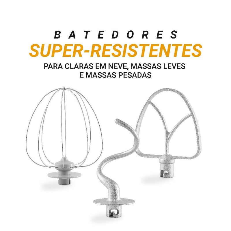 Acompanha três batedores: massa pesada, massa leve e clara em neve, garantindo versatilidade para cada tipo de preparo.