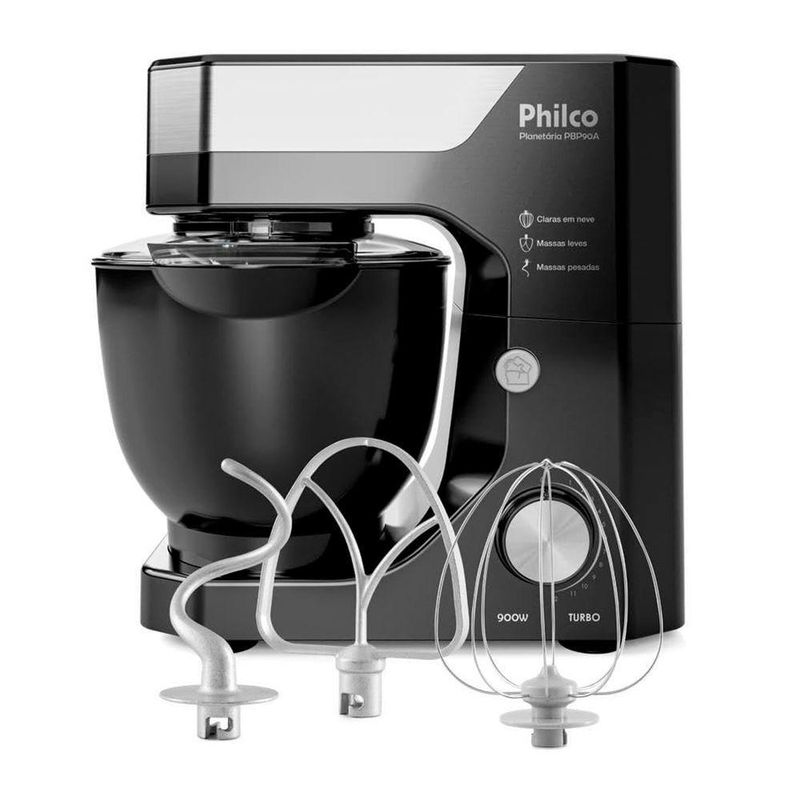 Marca: PhilcoModelo: PBP90APotência: 900WTensão: 110VVelocidades: 12 + função turboCapacidade da tigela: 5LMaterial da tigela: Plástico com tampa antirrespingoBatedores: 3 (massas leves, pesadas e claras em neve)Sistema: Rotação planetáriaCor: PretoBase: Antiderrapante com porta-fioUso: Doméstico