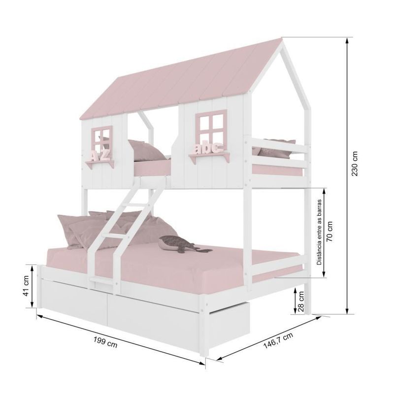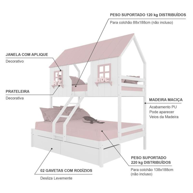 Quantidade de Volumes: 05 Material Principal: Madeira Maciça | Cor Predominante: Branco/ Rosa | Necessita Montagem: Sim | Acompanha Colchão: Não | Tipo de Cama: Beliche Casal/ Solteiro | Altura: 230 | Largura: 146,7 | Comprimento: 199 | Peso: 105 | Peso máximo suportado: 120 | Cor Via: Branco/ Rosa | Peso com Embalagem: 105 | Comprimento com Embalagem: 192 | Largura com Embalagem: 30 | Altura com Embalagem: 30 | Tamanho da Cama: Beliche Casal/ Solteiro | Descrição do Tamanho: Beliche Casal/ Solteiro | Quantidade de Caixas: 05
