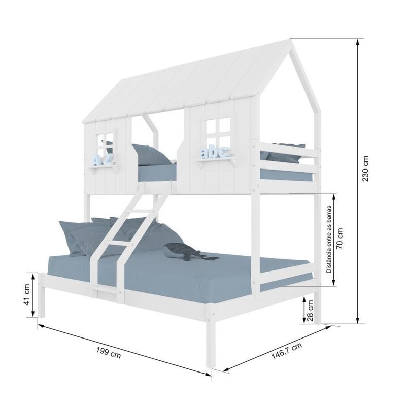 Quantidade de Volumes: 04 Material Principal: Madeira Maciça | Cor Predominante: Branco | Necessita Montagem: Sim | Acompanha Colchão: Não | Tipo de Cama: Beliche Casal/ Solteiro | Altura: 230 | Largura: 146,7 | Comprimento: 199 | Peso: 82 | Peso máximo suportado: 120 e 220 | Cor Via: Branco | Peso com Embalagem: 82 | Comprimento com Embalagem: 192 | Largura com Embalagem: 30 | Altura com Embalagem: 30 | Tamanho da Cama: Beliche Casal/ Solteiro | Descrição do Tamanho: Beliche Casal/ Solteiro | Quantidade de Caixas: 04