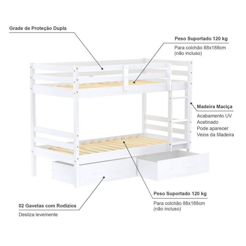 Quantidade de Volumes:03 Material Principal: Madeira | Cor Predominante: Branco | Necessita Montagem: Sim | Acompanha Colchão: Não | Tipo de Cama: Beliche | Cor: Branco