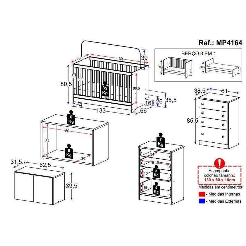 O Berço 3 em 1 com Colchão Armário Aéreo e Cômoda Multimóveis MP4164 é perfeito para tornar o quarto do bebê estiloso e funcional. Produzido em MDP com acabamento acetinado (cerca de 20% de brilho), garante durabilidade e resistência. O berço se transforma em sofá e minicama, acompanhando o crescimento do seu filho, possui 3 regulagens de altura para o colchão e acompanha suporte para mosquiteiro, garantindo noites mais tranquilas de sono para o bebê. A grade Soft (PVC) é produzida de maneira ecologicamente correta, com matéria-prima livre de metais pesados, atóxica e com proteção anti-amarelamento. Berço certificado pelo INMETRO sob o selo n° 0000085/2018. O colchão possui estrutura em espuma e tecido poliéster e um dos lados é impermeável. De conforto macio, possui tratamento anti-ácaro e anti-alérgico e é indicado para até 50kg.
