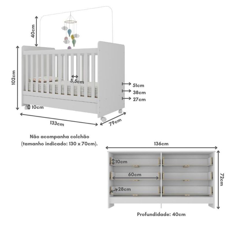 Dimensões do Berço - Altura: 102cm | Largura: 133cm | Profundidade: 79cm
