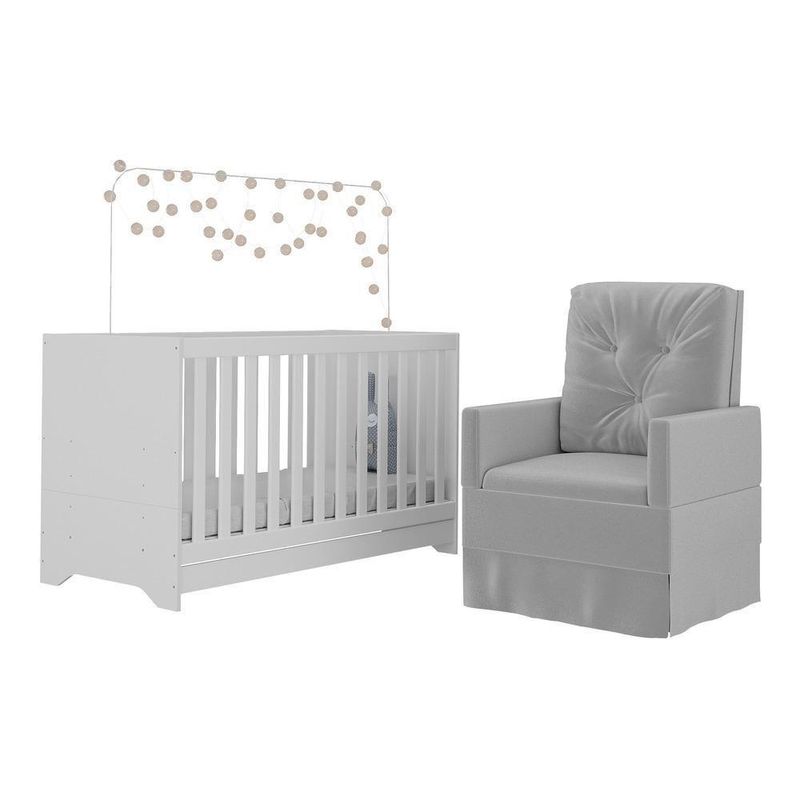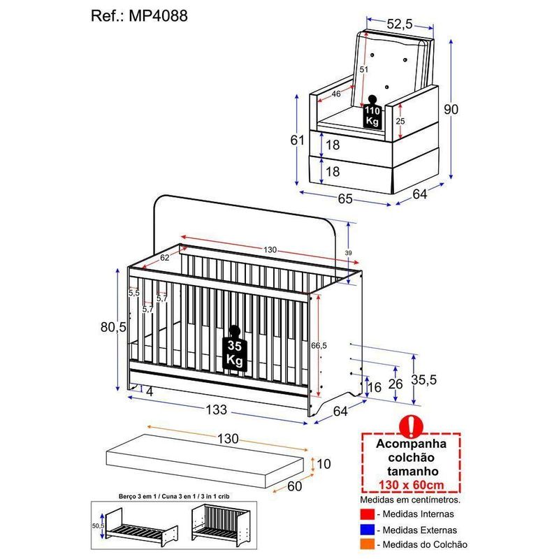 O Berço 3x1 com Colchão Incluso e Poltrona de Amamentação Elza Multimóveis MP4088 foi criado para complementar o quartinho, facilitando a vida da mamãe nos preparativos para a chegada do bebê. O berço é padrão (tamanho do colchão 130cm x 60cm), e se transforma em sofá e minicama, o que possibilita ser utilizado por mais tempo. Produzido em MDP com acabamento acetinado (cerca de 20% de brilho), que garante maior durabilidade e resistência. O lastro possui 3 regulagens de altura para o colchão e acompanha suporte para mosquiteiro, que garante noites mais tranquilas de sono. A grade Soft (PVC) é produzida de maneira ecologicamente correta, com matéria-prima livre de metais pesados, atóxica e com proteção antiamarelamento. Berço certificado pelo INMETRO sob o Selo n° 0000085/2018. O Colchão D18 (suporta 50kg), que acompanha o berço, é produzido 100% em tecido poliéster com preenchimento em espuma. Possui tratamento anti-ácaro e anti-alérgico e é indicado para crianças de até 3 anos. A poltrona de amamentação é produzida em madeira de eucalipto, com revestimento em tecido veludo, molas reforçadas e mecanismo de balanço, proporcionando muito aconchego. Capaz de suportar 110kg, o assento possui densidade D23, que garante maior conforto e durabilidade.