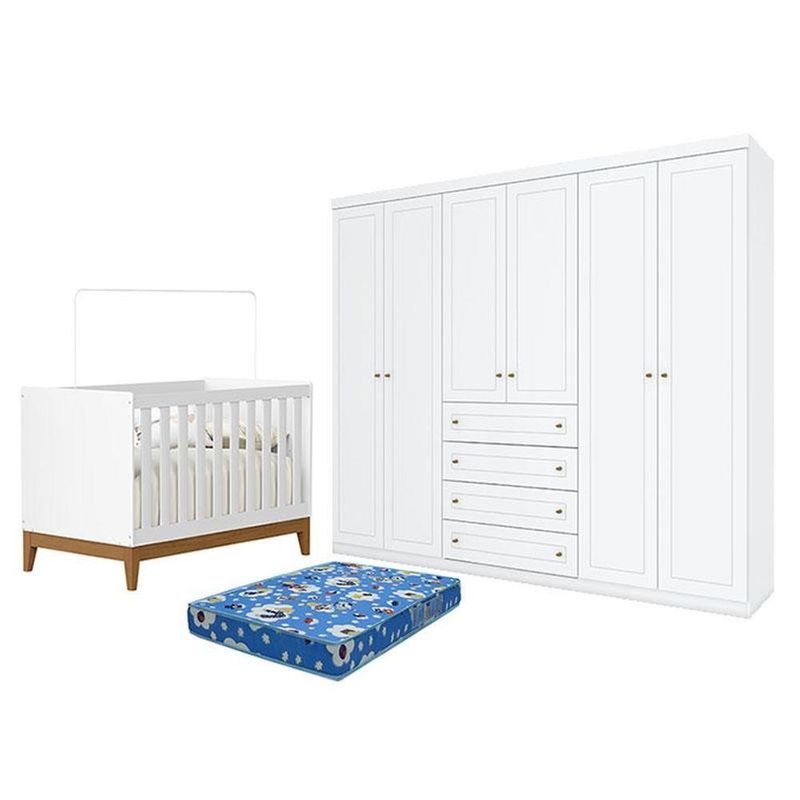 Berço Americano Flip Branco Acetinado Reller E Guarda Roupa Casal Americano 6 Portas Branco Hp E Colchão Ortobom - Henn
