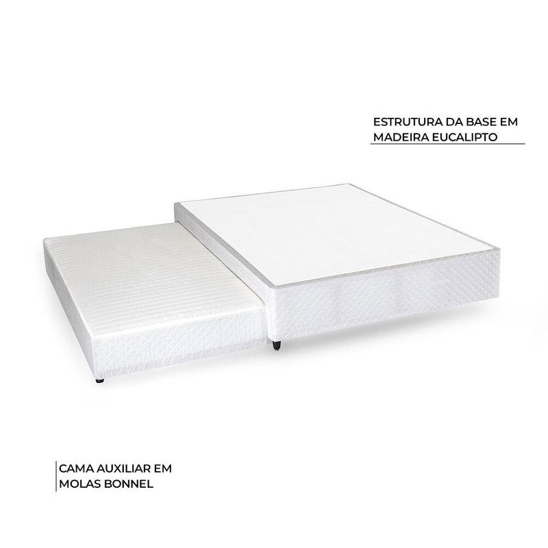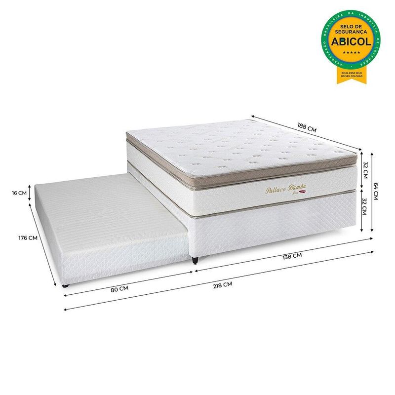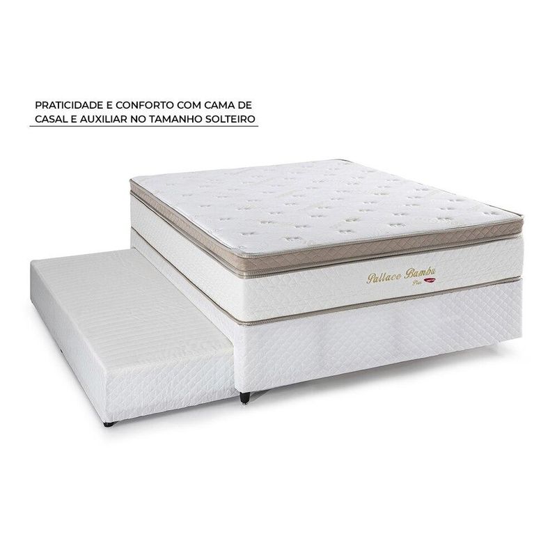 BICAMA CASAL COM CAMA AUXILIAR HERVAL PALLACE BAMBU, MOLAS ENSACADAS, 64X138X188 CM ESTRUTURA O colchão é de conforto firme, estruturado por molas ensacadas e pela Ecospuma®. A união desses componentes garante sustentação mais uniforme. A base é estruturada por madeira eucalipto, que garante melhor sustentação. O colchão auxiliar é composto por molas Bonnel, que lhe dão um suporte firme. REVESTIMENTO O colchão é revestido em tecido malha bambu, um material leve e nobre, que garante que as camadas de espuma da estrutura respirem. A base tem revestimento em tecido Jacquard bege.