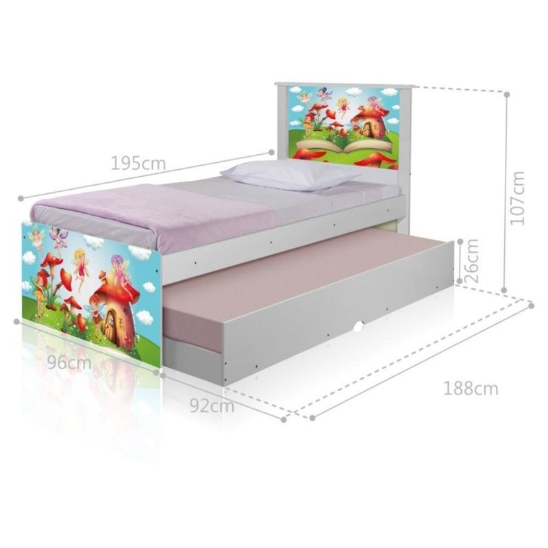 Bicama Bibox Juvenil Barcelona Adesivada Mundo das Fadinhas com 2 Colchões - BrancoRef. 1416A Bicama Bibox Juvenil Barcelona Adesivada Mundo das Fadinhas é belíssima e conta com um design funcional, que ocupa pouco espaço no ambiente.A Coleção Mundo das Fadinhas foi desenvolvida por nossos designers oferecendo um visual exclusivo, descontraído e divertido ao ambiente.A cama auxiliar fica embaixo da principal e basta puxá-la por meio das corrediças para começar a fazer uso dela.É ideal para quartos pequenos e para caso precise de uma cama extra para receber um amigo, ou divida o dormitório com alguém.Feita em MDF e MDP e seu acabamento é feito com pintura UV brilhante tornando-a um produto resistente e com aspecto de por muito mais tempo.É uma excelente escolha para acomodar colchões de solteiro na medida de 188 cm x 88 cm de largura. - Medidas da Cama:Altura: 107 cmLargura: 96 cmComprimento: 195 cm - Medidas da Cama Auxiliar:Altura: 26 cmLargura: 188 cmComprimento: 92 cm Informações do produto:- Cor do produto: Branco- Material: MDF/MDP- Colchão Incluso: 2 unidades (88cm x 188cm - solteiro)- Tipo de Colchão: Espuma D20- Garantia: 3 meses contra de fabricação.- Peso máximo suportado: 95 kg por cama. Itens Inclusos:01 Cama Solteiro com Cama Auxiliar.02 Colchões solteiro D20 88cm x 188cm.Kit completo para montagem, manual detalhado de instruções. Informações complementares:- Fotos meramente ilustrativas do produto no ambiente.- Verificar descrição e tamanho do produto antes da compra.- Avaliar a mercadoria no ato do e recusar em caso de divergência ou .- Mantenha as informações de e de atualizados para entrarmos em caso necessário.* Sugerimos a contratação de um montador para a montagem do produto. Não nos responsabilizamos por causadas no ato da montagem.* Não nos responsabilizamos pela montagem e desmontagem do produto no ato da e , assim como os custos gerados nestas situações.* A transportadora entregará o produto no andar térreo do de .* Não nos responsabilizamos por subir escadas, corredores e elevadores ou por guincho em apartamentos. MATERIAL PRINCIPAL: MDF/MDP | ESTADO DE ORIGEM: SP | ALTURA DO PRODUTO (CM): 107 | PESO PRODUTO COM EMBALAGEM (KG): 46,9 | CONTEÚDO DA EMBALAGEM: 1 Bicama E 2 Colchões | ALTURA DO PRODUTO COM EMBALAGEM (CM): 53 | COR PREDOMINANTE: Branco | MODELO: Bicama Juvenil Adesivada Mundo das Fadinhas com Colchões | DESCRIÇÃO DO TAMANHO: Altura: 107 cm Largura: 96 cm Comprimento: 195 cm | PRODUTO PRECISA DE MONTAGEM?: Sim, a montagem é simples mas sugerimos a contratação do nosso de montagem (para os CEPs em que o está disponível) ou de algum experiente de sua preferência | COMPRIMENTO DO PRODUTO (CM): 195 | COMPRIMENTO PRODUTO COM EMBALAGEM (CM): 195 | LARGURA DO PRODUTO (CM): 96 | MATERIAL PARA FILTRO: MDF/MDP | LARGURA PRODUTO COM EMBALAGEM (CM): 88 | INSTRUÇÕES/CUIDADOS: Limpar com pano macio e seco, não utilizar produtos abrasivos. | CORES DO PRODUTO (FILTRO DE CORES): Branco | PESO DO PRODUTO (KG): 46,1