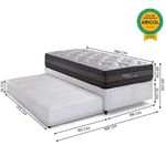 DIMENSÕES (AxLxP| Peso) Colchão: 28x88x188 cm | 17kg Base com cama auxiliar: 32x88x188cm | 38kg Cama Auxiliar: 16x80x173cm Cama Completa: 60x88x188cm | 55 kg