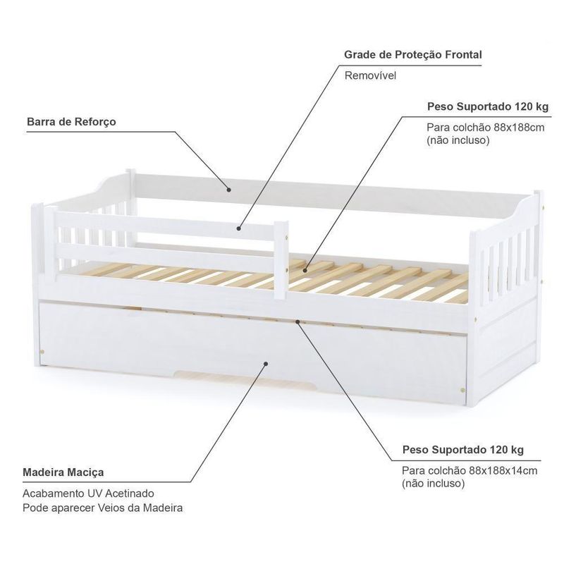 Bicama Solteiro Com Grade De Proteção Madeira Maciça Branco Mobilistore