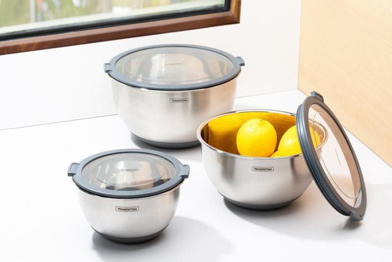 O bowl Tramontina Cucina em aço inox de 5 litros é ideal para quem precisa de espaço e praticidade na cozinha. Produzido em aço inoxidável, é resistente, higiênico e fácil de limpar, preservando os alimentos com segurança. A tampa transparente com vedação hermética mantém o frescor por mais tempo e permite visualizar o conteúdo sem abrir. A base de silicone antiderrapante garante firmeza durante o uso, evitando deslizamentos na bancada. Com design empilhável, facilita a organização e aproveita melhor o espaço nos armários ou na geladeira. Perfeito para preparar, armazenar e servir com eficiência em grandes volumes.