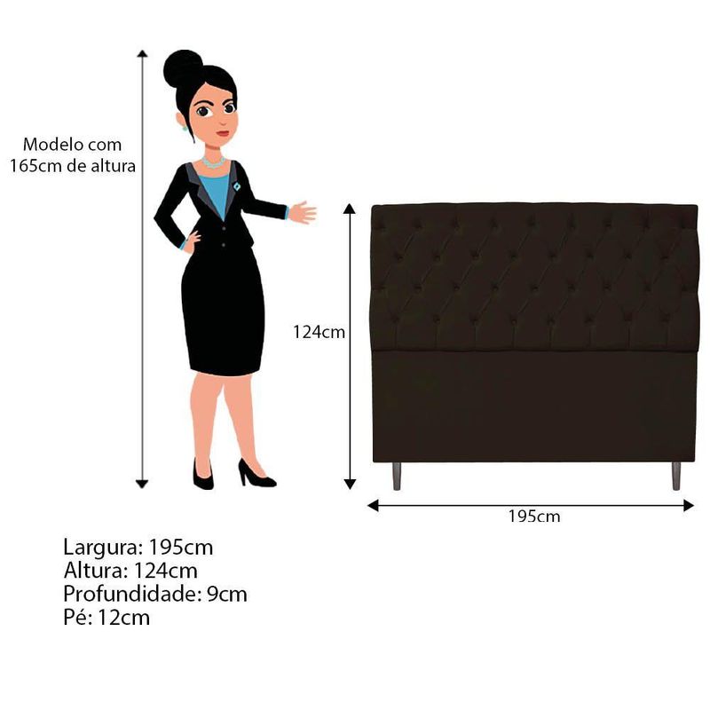 Gostaria de um móvel que trouxesse mais elegância e sofisticação para o seu lar? A Cabeceira Liverpool é sua melhor opção! Com característica moderna e com acabamento de qualidade, este produto atenderá suas expectativas! Projetada para atender um requisito intimista e aconchegante, transmitindo a ideia de um contexto refinado e singular. Além disso, seu design foi desenvolvido carinhosamente, pensando em levar até você um conforto inigualável. Seus detalhes em botonê garantem um toque final de bom gosto e luxuosidade. Especificações Técnicas da Cabeceira Liverpool: - Altura: 124 cm; - Largura: 195 cm; - Profundidade: 9 cm; - Altura dos pés: 12 cm; - Peso: 10 kg. Diferenciais da Cabeceira Liverpool: - Material da Estrutura: fabricado com Madeira Pinus e Eucalipto Reflorestada, e alguns detalhes em MDF; - Detalhes do Pé: acompanha um kit de pés (2 pés), com alta resistência; - Volumes: nessa compra você receberá um único produto. Recomendações de limpeza: -Limpar com flanela limpa e seca. Não molhar o móvel e não expor em lugar úmido ou próximo de fontes de calor. Não usar produtos abrasivos. Observações Importantes: - As imagens ambientadas são meramente ilustrativas e podem apresentar itens que não compõe o produto; - Objetos decorativos que aparecem na foto não acompanham o produto; - As cores do produto podem variar de acordo com o monitor, a iluminação do ambiente, ou sua percepção visual; - A Cabeceira Liverpool chegará montada para você, bastando rosquear os pés; - Confira as dimensões antes da compra e certifique-se de que o produto passará por elevadores, portas e corredores, já que nossa entrega não inclui a subida de lances de escada, ou o lançamento de produtos; - Ao receber seus produtos, verifique no ato do recebimento qualquer dano na embalagem. Caso tenha alguma avaria, favor não assinar o comprovante de recebimento (A transportadora tem obrigação de esperar a conferência); - Produto para uso residencial em ambiente interno, não devendo ficar exposto diretamente ao sol, calor e umidades excessivas.