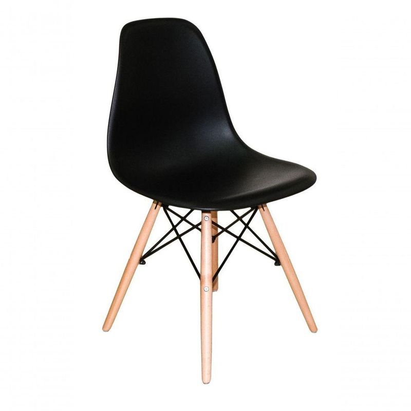 As pernas da cadeira são em madeira e fios de aço preto no qual garantem estabilidade à cadeira.
