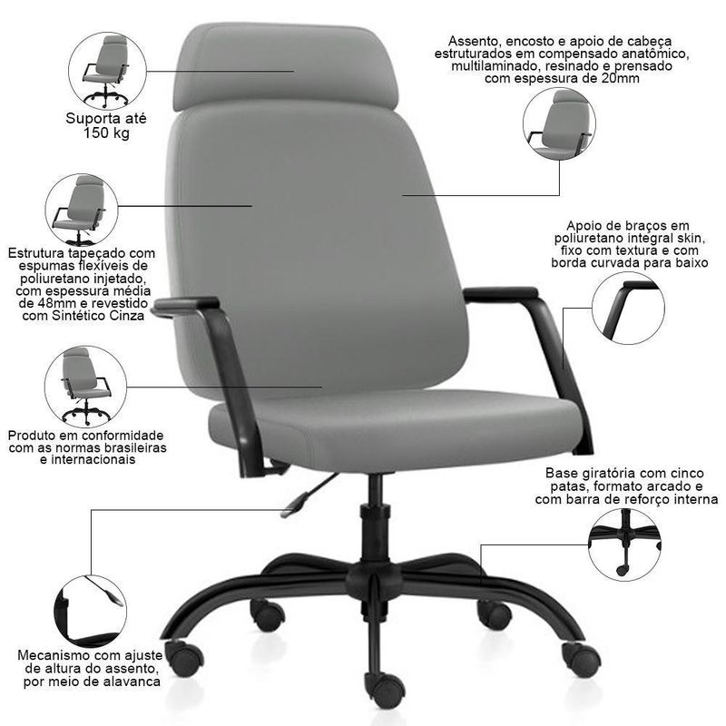 Cadeira De Escritório Giratória Diretor Com Apoio De Cabeça Hub F02 Sintético Cinza - Lyam Decor