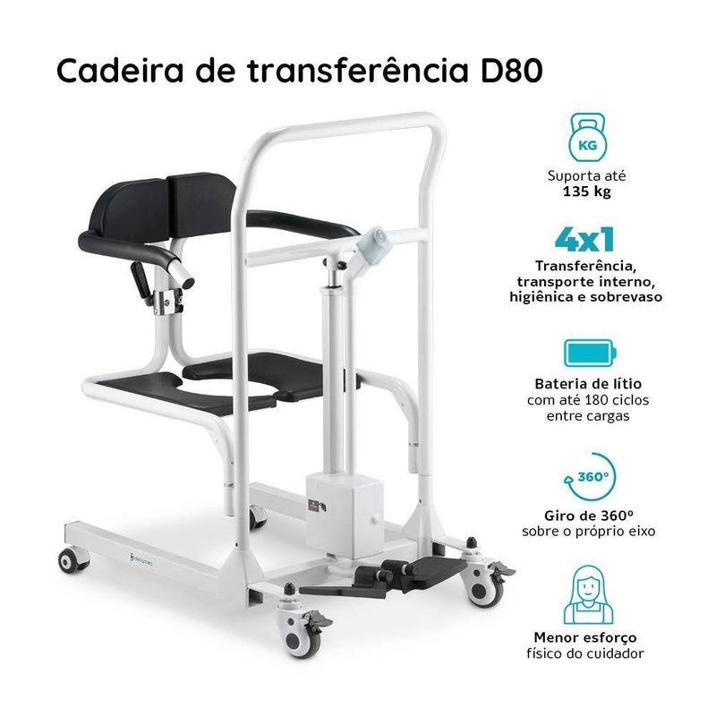 A Cadeira de Transferência Higiênica Elétrica Dellamed D80, ideal para pessoas com mobilidade reduzida. Com assento de 48,5 cm e capacidade para até 135 kg, essa cadeira oferece sistema de elevação eletrônico, facilitando a transferência entre ambientes. Versátil, funciona como cadeira de transferência, cadeira de transporte interno e cadeira sobre vaso, proporcionando conforto e praticidade. Fabricada com estrutura de aço carbono e espuma rígida de poliuretano, possui rodas com trava, garantindo segurança e estabilidade. A classificação IP44 oferece proteção contra respingos de água, sendo ideal para banheiros. A cadeira vem com bateria de lítio com até 180 ciclos de autonomia e montagem simples com apenas 12 peças.Importante: A Cadeira Dellamed D80 é limitada a uso residencial e não é indicada para necessidades assistenciais intensas.Especificações Técnicas: