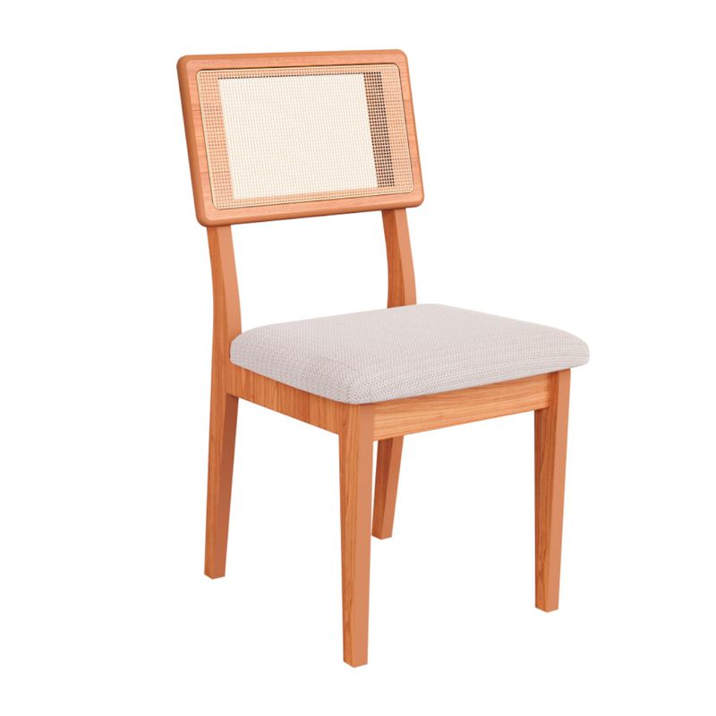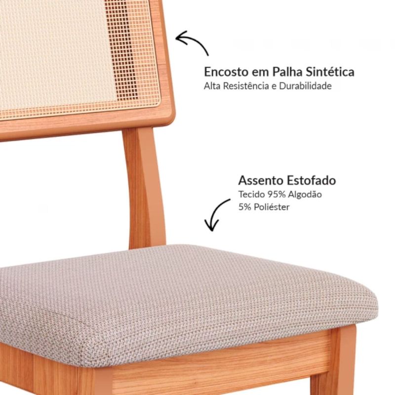O assento da cadeira é estofado com tecido na cor Bege Rústico, que proporciona um conforto adicional durante o uso. O estofamento é feito com materiais de qualidade, garantindo uma superfície macia e agradável para se sentar. O tecido utilizado possui uma tonalidade clara, o que contribui para a sensação de leveza e harmonia do conjunto.