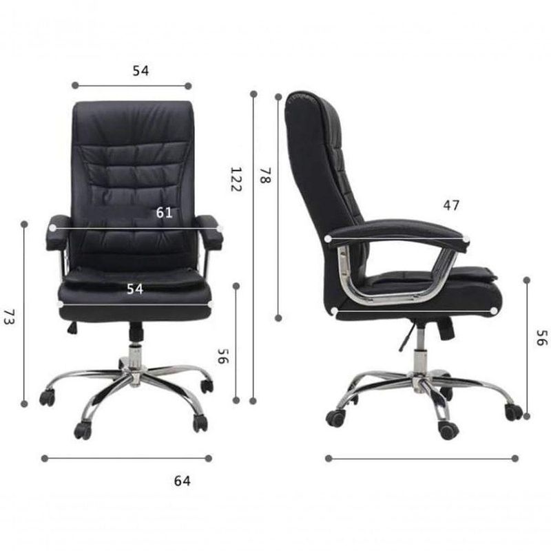 Assento: Estrutura Revestida em PUBase: Aço CromadoProfundidade: 60cmLargura: 64cmAltura Total: Alta 123 cm - Baixa 113 cmAltura do Chão até o Assento: Alta 60 cm - Baixa 50 cmAltura do Chão até o Braço: Alta 79 cm - Baixa 69 cmProfundidade interno no assento: 51cmLargura interno do assento? 54cmBase Estrela com 70cm de diâmetro.Peso Máx. Recomendado: 120 kgsPeso Unitário: 12 kgsGarantia: 90 dias após o recebimento.