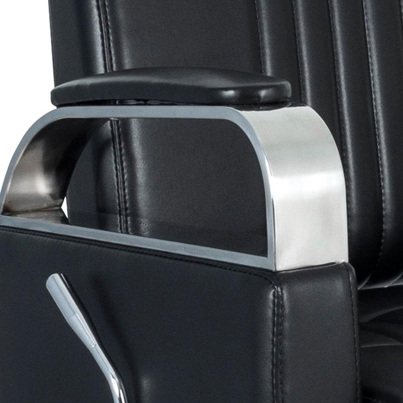 Além de super confortáveis, oferecem maior segurança devido a sua resistência, uma vez que são fabricadas com matéria-prima de alta qualidade e se destacam pelos acabamentos que agregam um luxo especial ao produto. Modelo PEL-6413 Especificações: Apoio de cabeça 12x17cm com 5 regulagens de altura; Estrutura resistente reforçada em madeira multilaminada e metal; Encosto e assento estofados e revestidos em couro PU Preto; Encosto reclinável com ajuste de parada em diferentes ângulos, com acionamento via alavanca lateral; Braços estofados com acabamento cromado; Altura ajustável com pistão hidráulico; Pedaleira fixa em metal cromado de 4x30cm; Base redonda em metal cromado com borracha antiderrapante; Peso máximo recomendado de 120kg. Medidas Aproximadas