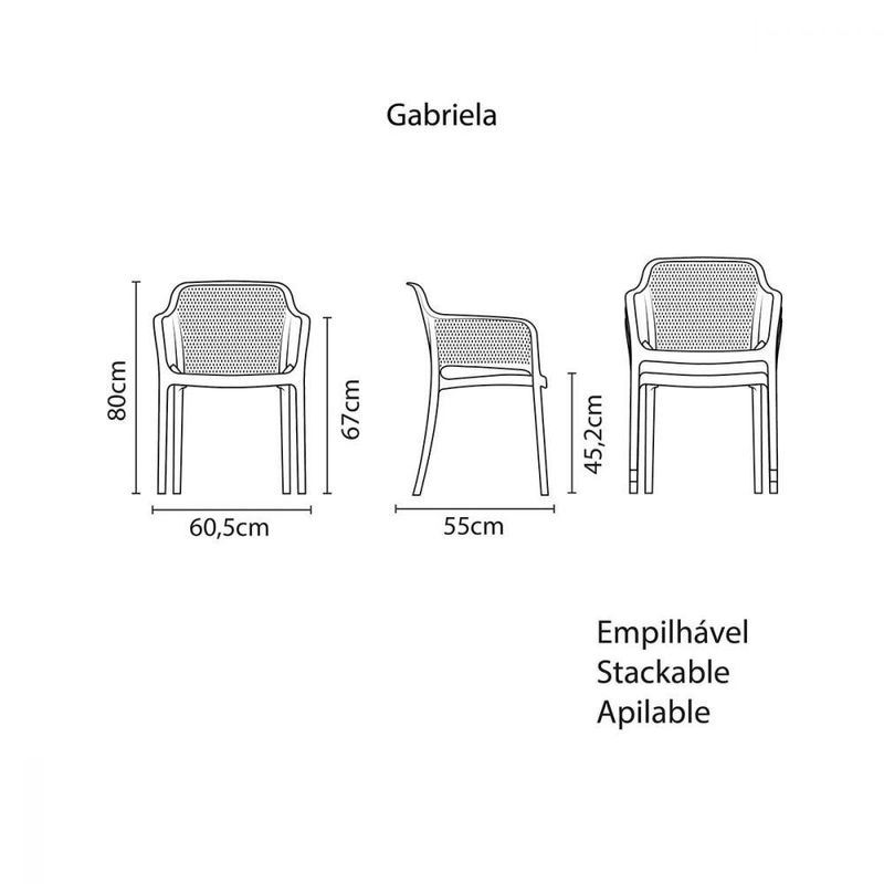 Cadeira Tramontina Gabriela Preta em Polipropileno e Fibra de VidroA Cadeira Tramontina Gabriela em Polipropileno e Fibra de Vidro da linha Summa tem como inspiração toda a elegância da atriz francesa, a belíssima Gabriela. Projetada especialmente para compor um ambiente com muita sofisticação e praticidade, a cadeira oferece o conforto necessário para o uso diário, além de agregar aos espaços comerciais ou residenciais. A Gabriela é produzida em polipropileno e fibra de vidro, ou seja, ela é altamente resistente e durável. E para manter suas características originais e toda a sua beleza, é indicado não jogar-se sobre a cadeira ou apoiar-se somente nas duas pernas traseiras. Evite longa exposição ao sol. Especificações Técnicas