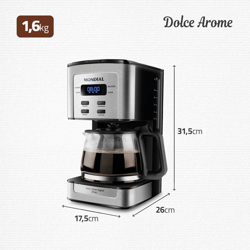 A Cafeteira Elétrica Dolce Arome C-44-32X-SDI é a cafeteira que faltava na sua cozinha. Com design sofisticado em aço escovado, ela tem painel digital e é programável em até 24 horas, ou seja, você pode acordar com o cheirinho do seu café pronto. Possui capacidade para até 32 xícaras de café, conta com filtro permanente e porta-filtro removível que dispensa o uso de filtro de papel, além de uma bela jarra de vidro. Saiba mais sobre a C-44-32X-SDI da Mondial: