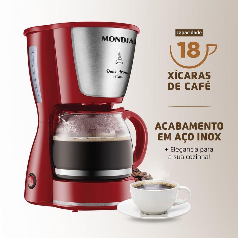 A Cafeteira Elétrica C-35-18X prepara até 18 xícaras de café. Com jarra de vidro fácil de lavar, ela tem porta-filtro permanente, que dispensa filtro de papel. Tem ainda base aquecida para café quente a qualquer hora. Sua jarra de vidro não fica com resíduos e odores e pode ser levada à mesa. Com seu sistema corta-pingos, você pode retirar a jarra para servir o café mesmo durante o preparo. Seu porta-filtro é permanente e pode ser retirado, sendo mais econômico e ecológico. Já a tampa basculante traz mais facilidade na hora de colocar a água e o pó de café. Esta cafeteira tem ainda um indicador de nível de água, mostrando quantas xícaras serão feitas, para você passar o café na medida certa. A Cafeteira Elétrica Dolce Arome C35-18X foi desenvolvida para uso doméstico, sendo melhor para uso residencial. Tudo isso com 1 ano de garantia Mondial.Modelo - C-35-18XCor - Vermelho/InoxVoltagem (Tensão) - 127V/220VItens inclusos - 01 Cafeteira - Manual de InstruçõesMaterial da jarra - Jarra em inoxComprimento do cabo - 1,50mCapacidade do produto - 18 xícarasLuz indicadora - SimBaterias são necessárias - NãoTipo de tomada - 10AAlimentação - Energia ElétricaPotência - 550WQuantidade em ML por xícara - Não se aplicaFiltro - Removível e LavávelPeso - 0,940kgGarantia - 1 anoDimensões - 27,5cm x 20,2cm x 16,2cm (AxLxP)